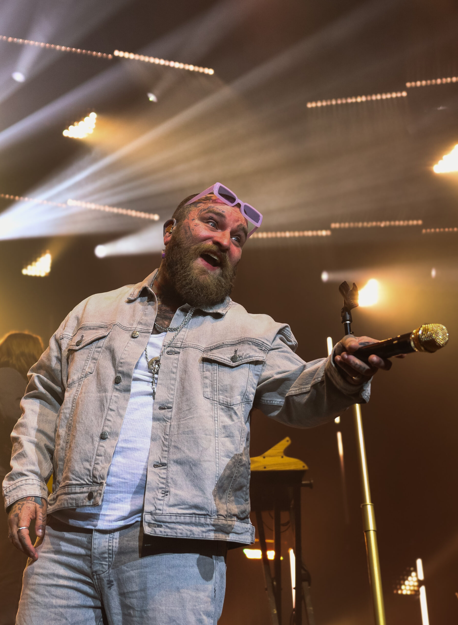 As the start time approached, anticipation built as the crowd began to eye the stage. The intro music played over the loudspeakers, signalling the entrance of Freaky Feely, the band that set the tone with a live intro. Suddenly, a figure donning purple glasses and double denim emerged from the side stage. Teddy Swims waved to the audience and kicked off the night with “Goodbyes Been Good To You.” From the first moment, he commanded the stage with his animated expressions, powerhouse voice, and playful demeanour. Teddy is a natural performer, seamlessly translating his online persona to his live show, chatting with the crowd during song intermissions and showcasing his down-to-earth, humble nature.